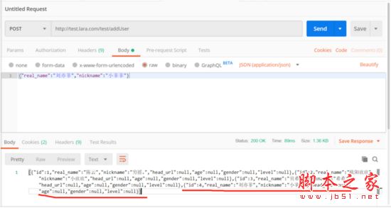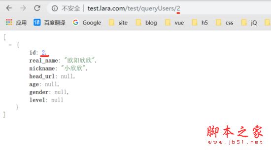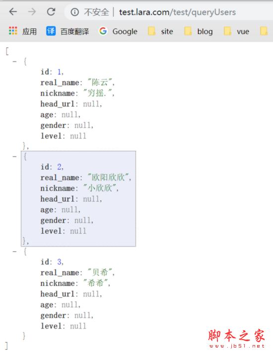 我們先來看結(jié)果, 地址欄鍵入(域名 + 路由): http://test.lara.com/test/queryUsers :