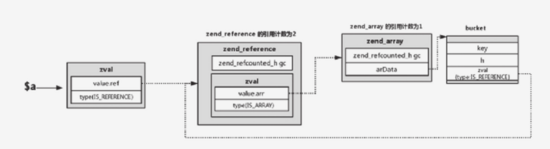 $c = $b; // $c,$b -> zval(type = IS_REFERENCE, refcount = 2) -> zend_string