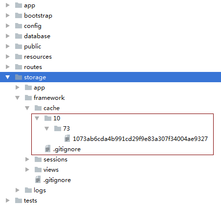 由于這里我們就使用默認(rèn)的文件緩存,那么執(zhí)行該方法后,在storage下會(huì)生成新的緩存文件,如下圖所示