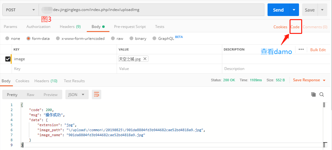 5、所以按剛才設(shè)想的,簡(jiǎn)單做下轉(zhuǎn)發(fā)還是不行,這里面參數(shù)的傳輸方式應(yīng)該還有另外一種,就是文件的類(lèi)型。鑒于是通過(guò)Postman方式上傳成功,這個(gè)工具確實(shí)很推薦多多學(xué)習(xí),他不僅作為一個(gè)第三方中間為我們驗(yàn)證接口是否可用,更給我們提供了調(diào)取接口的各種代碼Damo,如圖3中標(biāo)識(shí)的Code處,就是獲取Damo的按鈕。我們點(diǎn)擊可以看見(jiàn)Postman給我提供了三種,調(diào)取接口的方式。