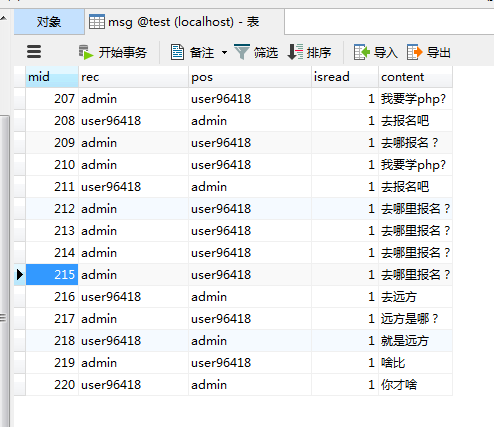 mid:主鍵,pos表示發(fā)送人,rec表示接收人,isread表示是否已讀,content表示咨詢/回復內(nèi)容。
