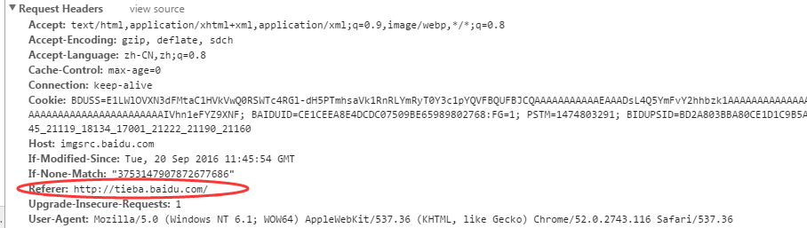 主要是該站點(diǎn)的圖片采用了防盜鏈的規(guī)則,其實(shí)這個(gè)規(guī)則也比較簡(jiǎn)單, 和大家一說就知道啦,主要是該站點(diǎn)在得知有請(qǐng)求時(shí),會(huì)先判斷請(qǐng)求頭中的信息,如果請(qǐng)求頭中有Referer信息,然后根據(jù)自己的規(guī)則來判斷Referer頭信息是否符合要求,Referer 信息是請(qǐng)求該圖片的來源地址。