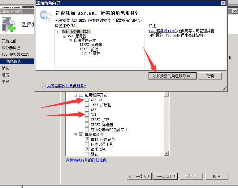 勾選ASP.NET會彈出以下窗口添加所需的角色服務(wù),勾選CGI(這里根據(jù)個人情況勾選,CGI是必選的,否則PHP不生效的)