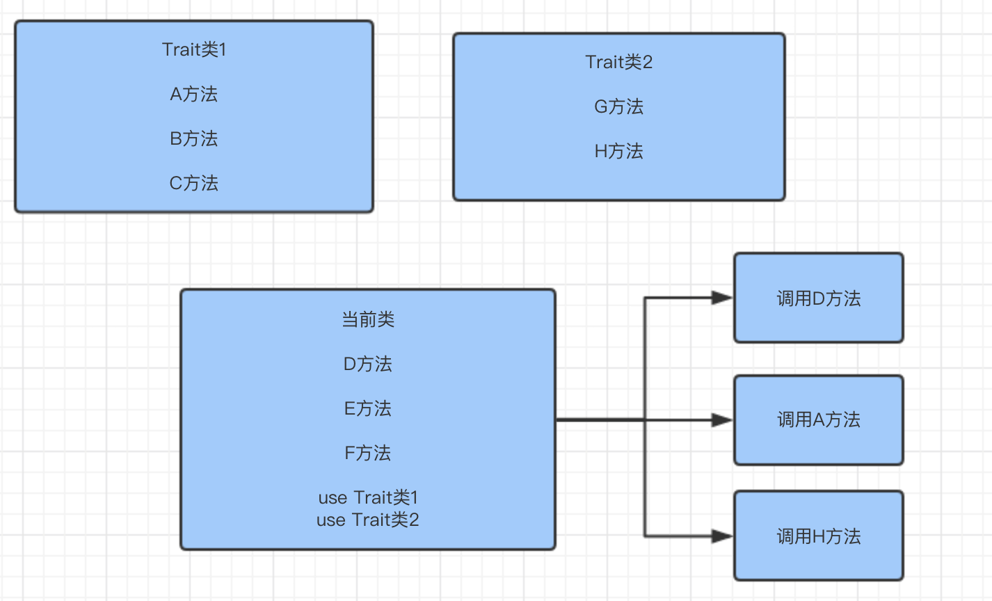 3、使用Trait類則完全將A、B兩個類的方法導(dǎo)入到當(dāng)前類中,可以視為當(dāng)前類的一部分,唯一區(qū)別是可以存在于當(dāng)前類同名的方法,此時由優(yōu)先級順序來控制。