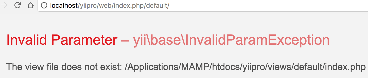 2.瀏覽器訪問(wèn)http://localhost/yiipro/web/index.php/default/,發(fā)現(xiàn)報(bào)錯(cuò)了