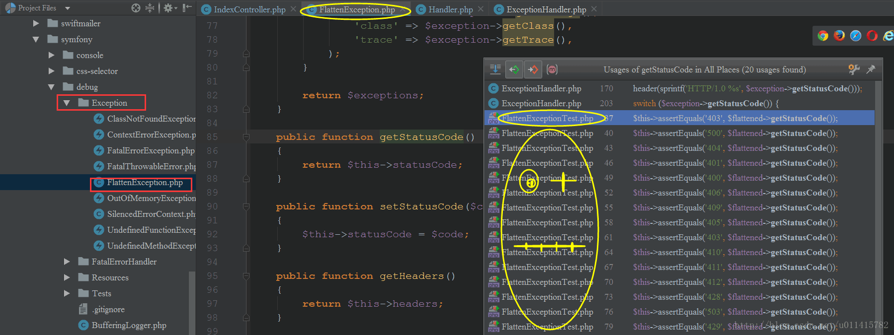 經(jīng)過對框架源碼的查看發(fā)現(xiàn),我們是通過實例化 FlattenException 類來獲得請求狀態(tài)碼的,根據(jù)提供的測試類 FlattenExceptionTest ,從而得出了上述的代碼,建議可以閱讀下源代碼以做比較