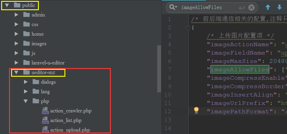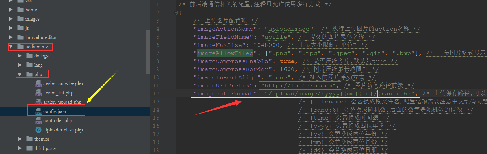 如果需要修改,可進(jìn)入php/config.json 文件,找到配置項 "imagePathFormat" 進(jìn)行符合需求的修改,建議可以讓文件名較長一些以避免重名: