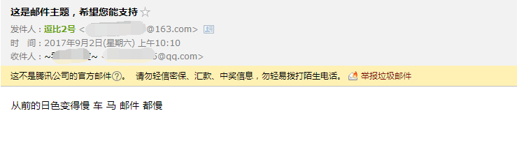 - 此方法為發(fā)送純文本郵件的功能實(shí)現(xiàn),調(diào)用此方法發(fā)送的郵件截圖如下: