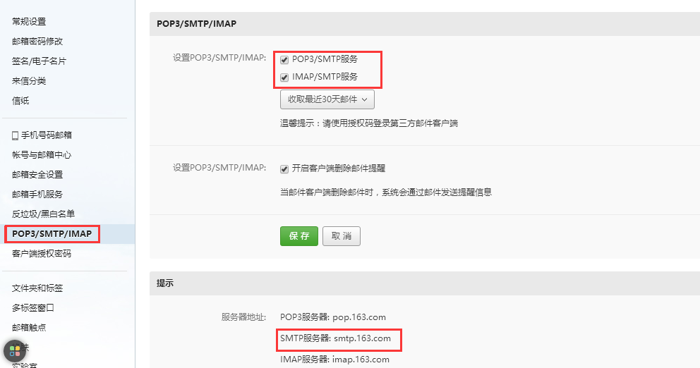 POP3/SMTP/IMAP”進(jìn)行下面的設(shè)置,著重記下服務(wù)器地址(SMTP 服務(wù)器:smtp.163.com)