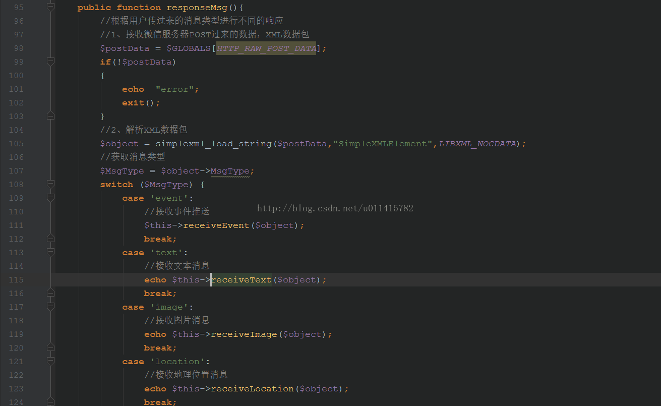 監(jiān)聽響應(yīng)消息的函數(shù)為 Weixin.class 中的 responseMsg(),對于其中詳細(xì)的數(shù)據(jù)處理可根據(jù)不同的觸發(fā)事件路徑進(jìn)行代碼的修改