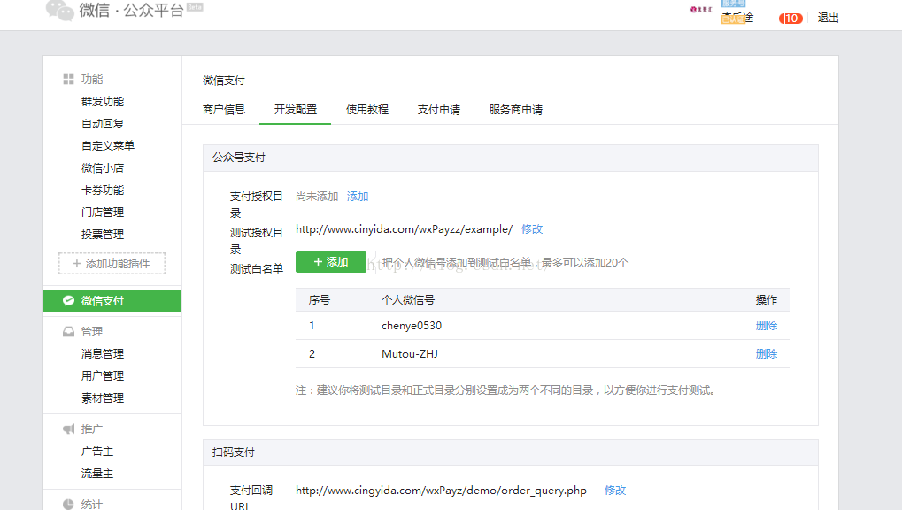 根據(jù)提示配置授權(quán)目錄,因為我暫時僅作為微信支付的測試,所以選擇的是“測試授權(quán)目錄”進行了路徑的填寫,參考部分網(wǎng)上建議,也親測發(fā)現(xiàn)該目錄寫到測試頁面的上一級目錄是最合適的,下圖可做參考。