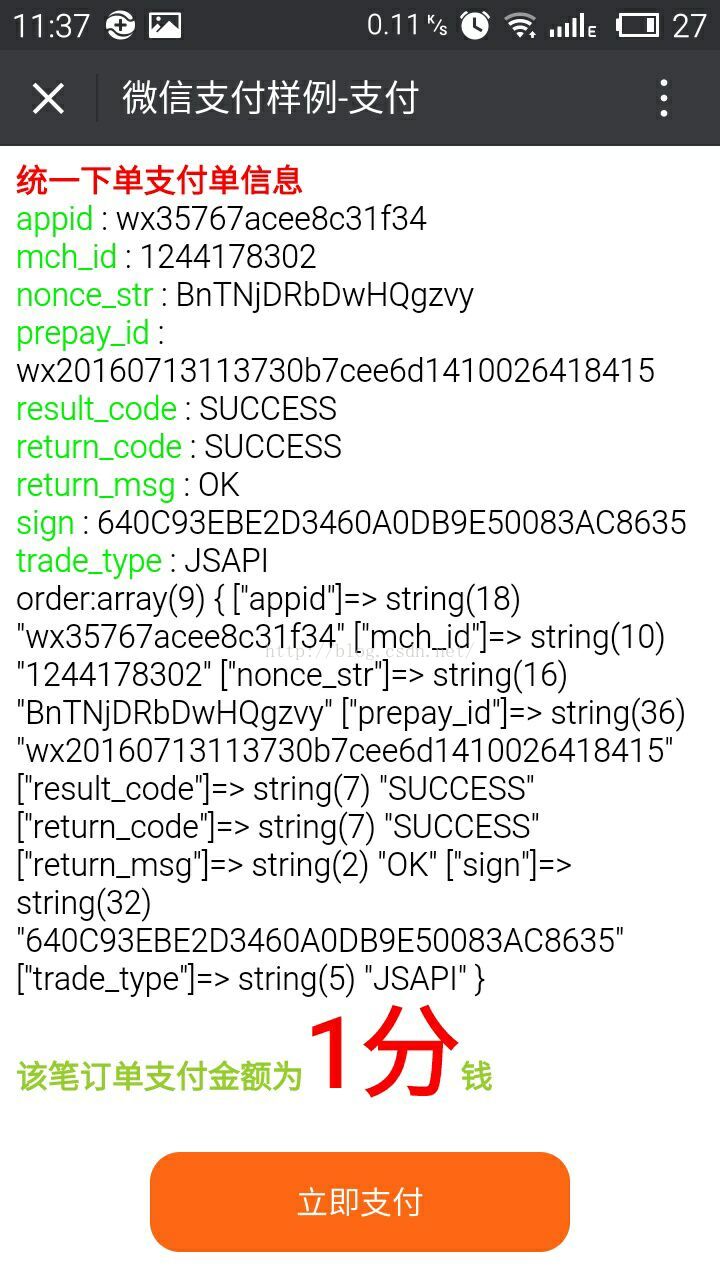 將需要訪問的支付界面的路徑生成二維碼 掃描。其中顯示的數(shù)據(jù)是由于我測試var_dump()打印出的信息,便于參考