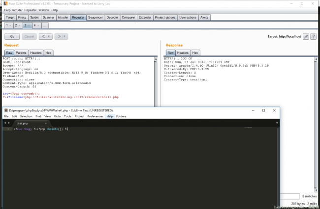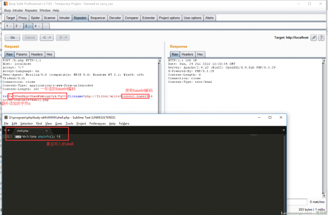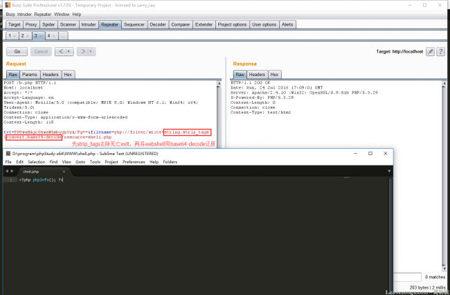 萬幸的是,php://filter允許使用多個過濾器,我們可以先將webshell用base64編碼。在調(diào)用完成strip_tags后再進行base64-decode。“死亡exit”在第一步被去除,而webshell在第二步被還原。