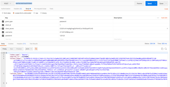 接下來,打開接口測試工具(postman),輸入接口地址: wechat.test/oauth/token ,請求類型 POST ,填上如下參數(shù),點擊 send 你會看到后臺返回了前端所需的 access_token :