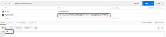 5、在 postman 中輸入購物車首頁接口地址,并傳入所需參數(shù),參數(shù)參考地址: http://laravelacademy.org/post/8909.html ,如圖: