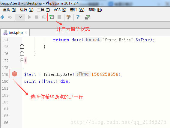 2、在你的phpstorm編輯器中,打開你在瀏覽器中頁面要經(jīng)過的代碼,并按下圖中操作。