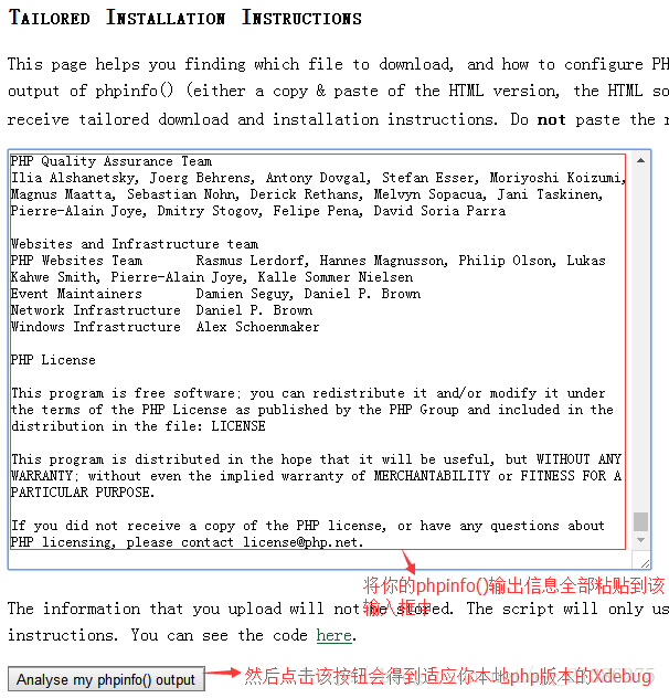 將phpinfo();的信息全部輸入網(wǎng)址:http://xdebug.org/wizard.php中的框,得到適配的xdebug版本,按照下圖中操作進行。