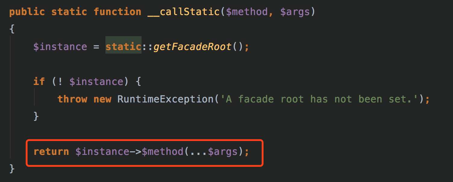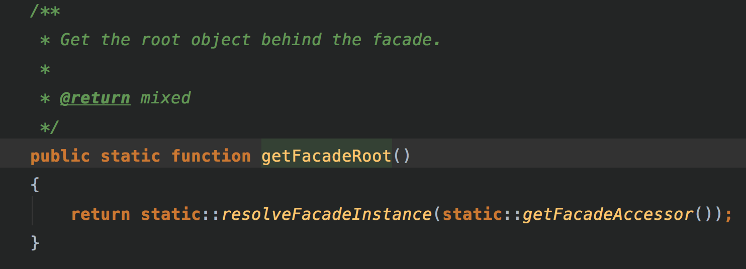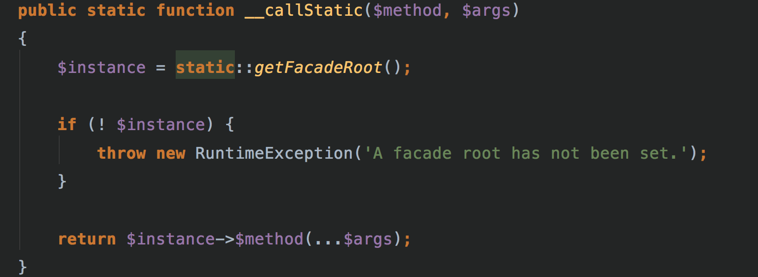 facade用來提供統(tǒng)一的接口,比如無論你用哪種cache,redis還是memcache,客戶端都可以用cache::get()方式來獲取value,至于具體是用了redis還是memcahe,就看你在sevice provider里面綁定了哪個。cache::get()的實現(xiàn)方式是,繼承Facade方法getFacadeAccessor,返回你在容器中綁定的key值,比如cache,然后Facade類會使用php魔術(shù)變量__callstatic(),callstatic的邏輯里面會從container里解析cache所綁定的服務(wù),就是前面提到的service provider綁定了誰
