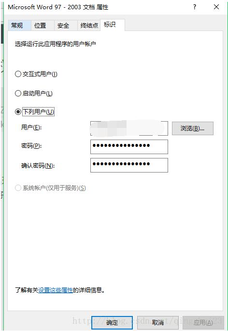 然后點擊 標(biāo)識 那一部分,將其選為 下列用戶 用戶填的是管理員用戶,密碼就是本機(jī)密碼。