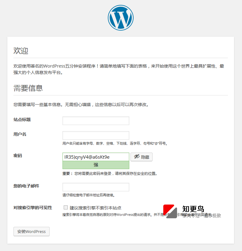 會看到wordpress的安裝界面,輸入相關信息完成安裝。