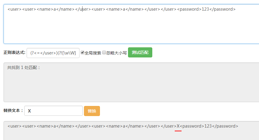 最后,在之前的正則表達(dá)式后面加上[\w\W]+貪婪匹配即盡可能多的匹配該位置后面的字符串。最終的正則表達(dá)式是(?=/user>)(?![\w\W]*?/user>)[\w\W]*