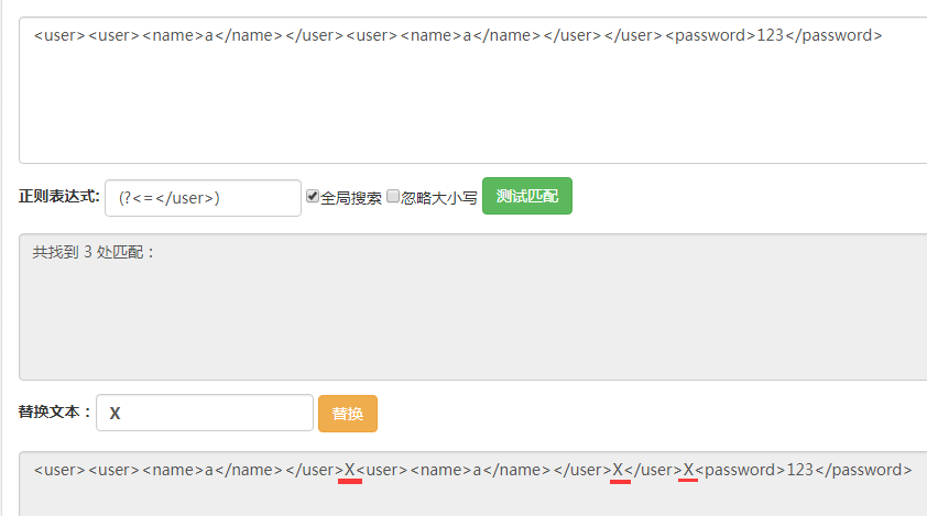 其次,再這三個(gè)位置上進(jìn)行篩選,能夠看出這三個(gè)位置的區(qū)別是后面是否有/user>,如果沒(méi)有的話那么它就是最后一個(gè)/user>后面的位置。在之前的表達(dá)式后面添上(?![\w\W]*?/user>)此時(shí)表達(dá)式變?yōu)?code>(?=/user>)(?![\w\W]*?/user>)。