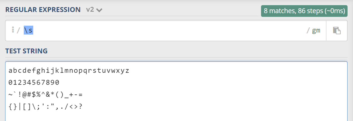 \s 空白符通配符,可以配到任意空白符,包括回車、換行、換頁、制表符等