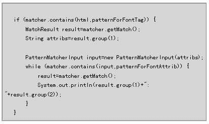 用TextFile.read( )方法來打開和讀取文件。mInput的功能是匹配'/*!' 和 '!*/' 之間的文本(注意一下分組用的括號)。接下來,我們將所有兩個以上的連續(xù)空格全都替換成一個,并且將各行開頭的空格全都去掉(為了讓這個正則表達式能對所有的行,而不僅僅是第一行起作用,必須啟用多行模式)。這兩個操作都用了String的replaceAll( )(這里用它更方便)。注意,由于每個替換只做一次,因此除了預(yù)編譯Pattern之外,程序沒有額外的開銷。