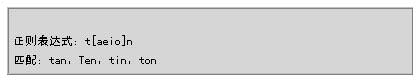 為了解決句點符號匹配范圍過于廣泛這一問題,你可以在方括號(“[]”)里面指定看來有意義的字符。此時,只有方括號里面指定的字符才參與匹配。也就是說,正則表達式“t[aeio]n”只匹配“tan”、“Ten”、“tin”和“ton”。但“Toon”不匹配,因為在方括號之內(nèi)你只能匹配單個字符: