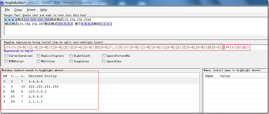 [0-9]|[1-9][0-9]|1[0-9]{2}|2[0-4][0-9]|25[0-5]\. ,因?yàn)槭屈c(diǎn)字符是元字符,所有需要轉(zhuǎn)義。這樣是不是可以了呢,我們發(fā)現(xiàn)有問(wèn)題,”|”優(yōu)先級(jí)最低,這樣會(huì)把最后\.字符表,組合為:“25[0-5] \.”了。因此,應(yīng)該是前面幾種情況,后面跟個(gè)”.”字符,正確是:([0-9]|[1-9][0-9]|1[0-9]{2}|2[0-4][0-9]|25[0-5])\. ,這樣就達(dá)到要求了。我們會(huì)發(fā)現(xiàn),實(shí)際上每家一個(gè)()字符,都一個(gè)子匹配,會(huì)在匹配結(jié)果里面出現(xiàn)()內(nèi)容。這里我們加()目的是,讓優(yōu)先計(jì)算,因此不需要里面子匹配內(nèi)容。我們可以加忽略子匹配內(nèi)容字符:?: ,結(jié)果將變?yōu)椋??:[0-9]|[1-9][0-9]|1[0-9]{2}|2[0-4][0-9]|25[0-5])\.