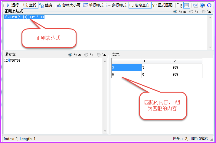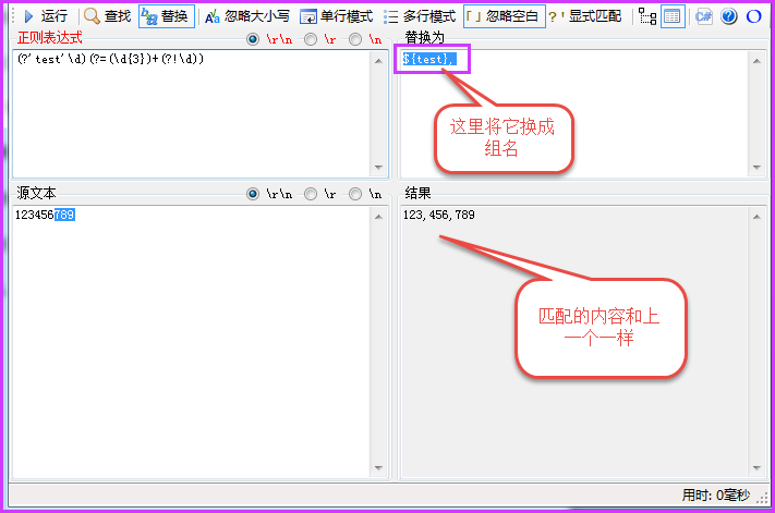 將上面正則表達(dá)式變換一下就好了,給第一個(gè)組分配一個(gè)組號(hào),這樣整個(gè)正則表達(dá)式就變成這個(gè)樣子:(?'test'\d)(?=(\d{3})+(?!\d)),這是后替換的原則就變成這個(gè)樣子,詳情請(qǐng)見(jiàn)下圖,原理都是一樣的。