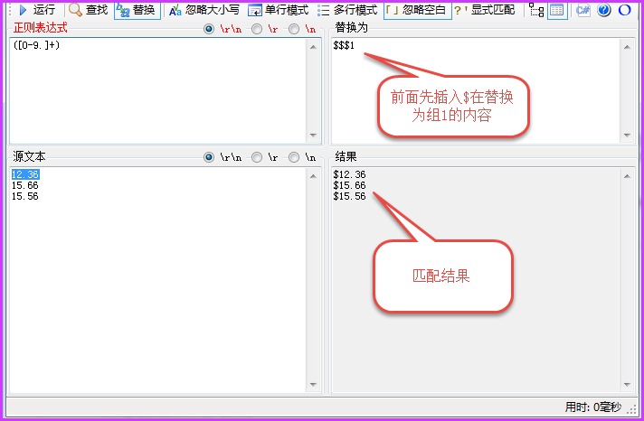 $$匹配元素是在匹配的內(nèi)容插入一個(gè)“$”字符,其實(shí)個(gè)人感覺(jué)兩個(gè)$$就像當(dāng)于是轉(zhuǎn)意字符的意思。將元字符$變成普通字符。下面有一個(gè)需求就是我們匹配一串浮點(diǎn)數(shù)字,將浮點(diǎn)數(shù)字轉(zhuǎn)換為貨幣。例如錢(qián)數(shù)為12.36,15.66,15.56這個(gè)正則表達(dá)式還算簡(jiǎn)單的,也就是([0-9.]+),先來(lái)看以下匹配的內(nèi)容,如下圖所示: