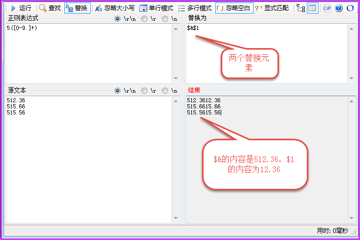 $表示的含義就是整個(gè)正則表達(dá)式的匹配的內(nèi)容也就是第0組里面的內(nèi)容。可以將上述的正表達(dá)式進(jìn)行改造一下,在前面加一個(gè)數(shù)字5。正則表達(dá)式就變成了這樣5([0-9.]+),那么原文本前面也加一個(gè)5這樣就不會(huì)變太多。匹配結(jié)果如下所示: