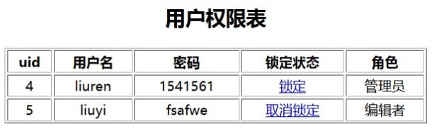 th>uid/th>th>用戶名/th>th>密碼/th>th>鎖定狀態(tài)/th>th>角色/th>