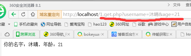 觀察實驗結(jié)果,當點擊按鈕,頁面會跳到1.get.php頁面,把內(nèi)容輸出。并且觀察上面的地址欄,會發(fā)現(xiàn)我們輸入的信息被放在了地址欄上。