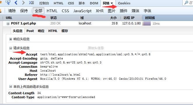 其實在傳遞數(shù)據(jù)的過程中,瀏覽器還會向服務(wù)端(后臺)發(fā)送一個請求頭包含一些請求的信息(GET請求也有頭部信息),我們打開開發(fā)者工具,找到網(wǎng)絡(luò)就可以看到我們的請求,點進去就是具體內(nèi)容,看上面的第二種圖,可以看到一些請求信息,有請求的編碼格式,還有請求地址等,具體可以自己私下了解。