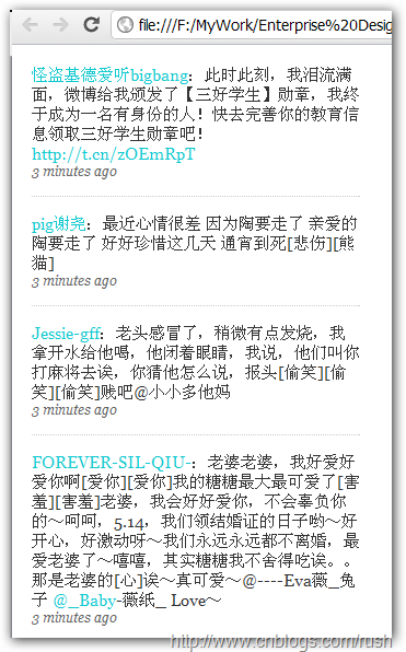 如上圖所示,我們使用$.ajax()方法調(diào)用公共微博接口,當成功獲取服務(wù)器回調(diào)數(shù)據(jù)插入到我們的頁面當中。
