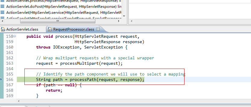 這一段代碼是判斷javax.servlet.include.servlet_path是否存在值,這個也是當一個頁面是以equestDispatcher.include方式顯示的話,這個屬性值才存在,所以這里的值沒有。之后進入path = request.getServletPath();這個方法是獲得返回請求URI上下文后的子串,所以這里的返回值就是“/”和訪問頁面名稱和后綴(這里和我的mvc實例截取的是不是一樣的道理)。隨后進入下面代碼: