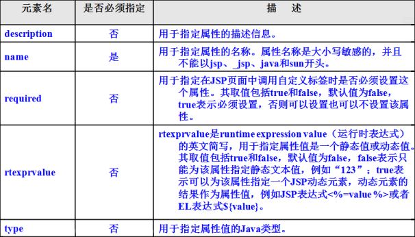 ?、?在TLD文件中對(duì)于的tag>標(biāo)簽下添加屬性的attribute>標(biāo)簽,同時(shí)attribute>標(biāo)簽下定義其從標(biāo)簽,其中name>從標(biāo)簽是必須要有的。attribute>標(biāo)簽所擁有的從標(biāo)簽如下:
