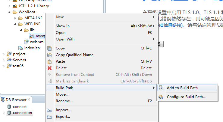 10,通過右擊mysql-connectior-java-5.1.6.jar,在Build Path中單擊Add to Build Path