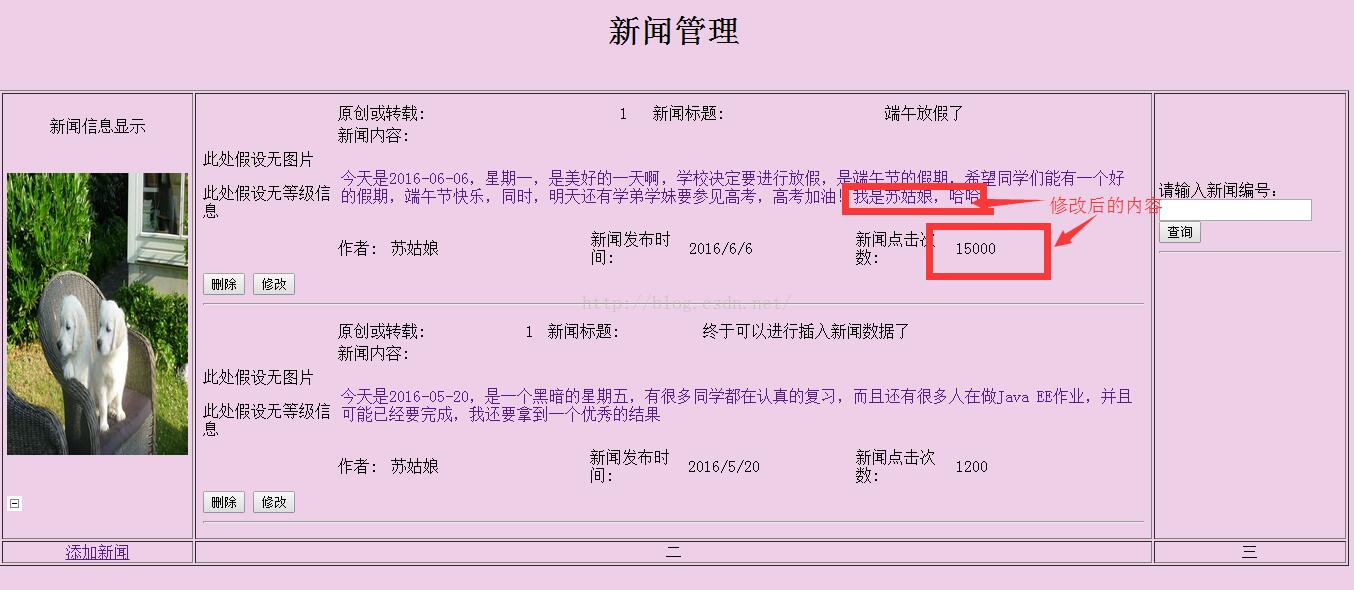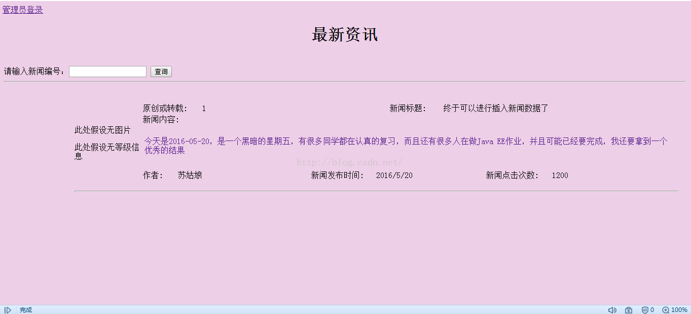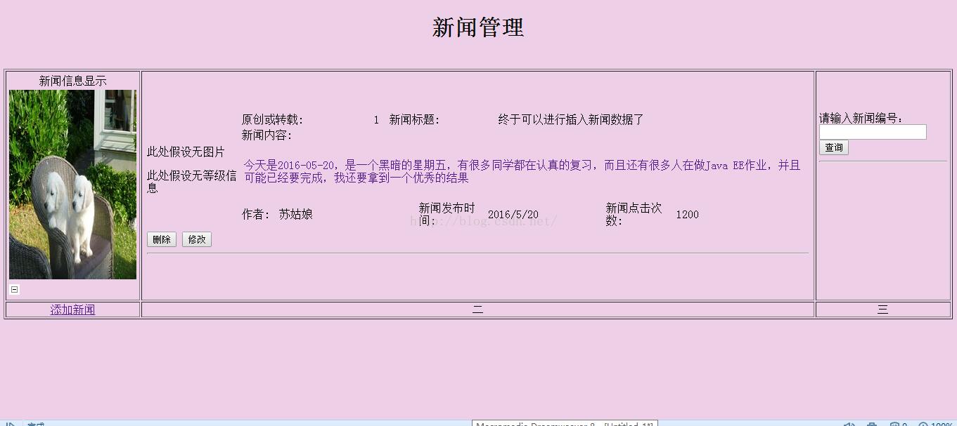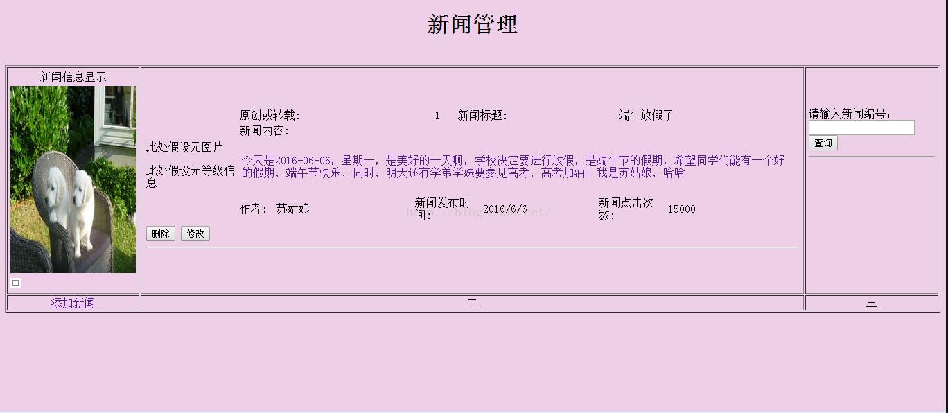 對(duì)于新聞的查找,與其他類似,在這里我們使用的是利用新聞編號(hào)進(jìn)行查詢所需的信息,然后在新的頁面上進(jìn)行顯示。