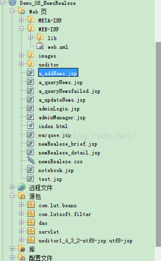 (1)首先建立以個(gè)項(xiàng)目,在此命名為Demo_08_NewsRealese,項(xiàng)目布局結(jié)構(gòu)如下圖所示,根據(jù)如下布局對(duì)項(xiàng)目進(jìn)行布局設(shè)計(jì),方便后面的編程,項(xiàng)目中web-inf為項(xiàng)目配置文件夾,images文件夾用于儲(chǔ)存項(xiàng)目中使用的圖片文件,ueditor為百度富文本編輯器文件夾,源包文件夾為Java類文件夾: