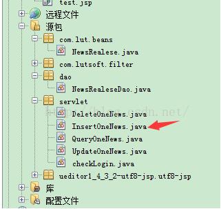 至此,我們完整的實(shí)現(xiàn)了插入工作 (7)現(xiàn)在完成刪除操作,在Servlet包中建立如下所示代碼,命名為DeleteOneNews.java:
