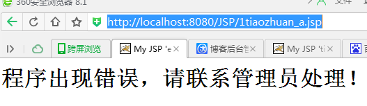 在頁面輸入無效的jsp頁面“http://localhost:8080/JSP/1tiaozhuan_a.jsp”,頁面會提示:
