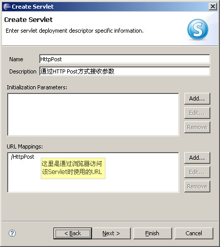 出現(xiàn)Servlet映射的配置界面,輸入適當的Description。注意下方的 URL Mappings,這個就是從瀏覽器訪問該Servlet時使用的URL。