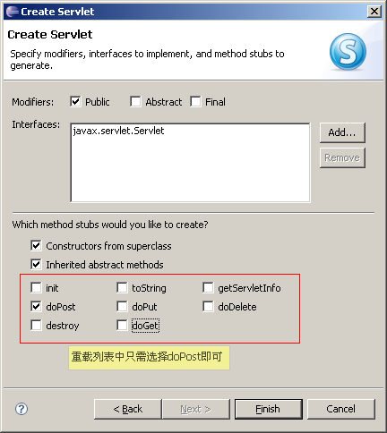 下一步選擇新建的類的屬性,通常選擇默認即可。 不過我們的Servlet只需要處理POST方法,所以下方的重載列表中只需選擇doPost即可。