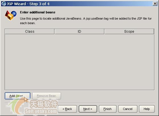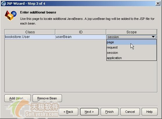 按OK后,返回到向?qū)У?步的對(duì)話框,此時(shí)對(duì)話框的Bean列表中多了一行記錄,可以在ID欄中為Bean指定一個(gè)名字,在Scope中指定Bean的作用域,如下圖所示: