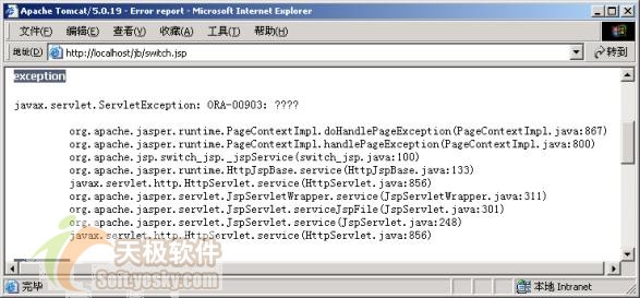 假設(shè)第11行的SQL查詢語(yǔ)句發(fā)生有錯(cuò)誤,如將用戶表名誤寫為User(正確為T_USER),當(dāng)switch.jsp被調(diào)用后,第14行將拋出SQLException異常,此時(shí)switch.jsp將顯示出異常堆棧跡的跟蹤信息頁(yè)面,如下圖如示: