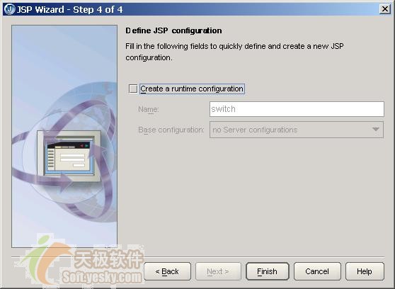 在向?qū)У淖詈笠徊?,你可以為?chuàng)建的JSP產(chǎn)生一個(gè)運(yùn)行配置項(xiàng),雖然向?qū)?chuàng)建一個(gè)運(yùn)行配置項(xiàng)設(shè)置為默認(rèn)選項(xiàng),但筆者認(rèn)為這并不是一個(gè)合理的默認(rèn)值,建議取消create a runtime configuration設(shè)置項(xiàng),不要?jiǎng)?chuàng)建JSP的運(yùn)行配置項(xiàng),如下圖所示: