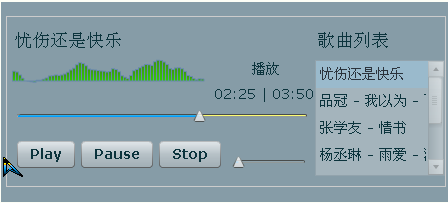 這個控件在本例中2處使用,實現(xiàn)對播放進(jìn)度和聲音大小的控制。最一開始調(diào)整播放進(jìn)度的問題難倒了我很久,因為在歌曲播放過程中HSlide要自動滑動當(dāng)前播放位置,同時又需要能手動拖動播放位置,HSlide本來有一個很好的change事件用來偵聽改變,但是我使用定時器設(shè)置HSlide的value的時竟然也給我觸發(fā)change事件,參考了Adobe哥官網(wǎng)的幫助文檔,說是Slider 組件的值因鼠標(biāo)或鍵盤交互操作而改變時調(diào)度,如果 liveDragging 屬性是 true,則在用戶移動滑塊時持續(xù)調(diào)度該事件。 如果 liveDragging 是 false,則在用戶釋放滑塊時調(diào)度該事件。但是無論我怎么設(shè)置,在代碼里改變了HSlide的value值怎會觸發(fā)change事件,不是說在用戶交互操作而改變時調(diào)度嗎?無賴啊,后來只能折中采取監(jiān)聽thumbDrag滑稈拖動時事件,這個事件Adobe哥的解釋是當(dāng)按下滑塊并隨后隨鼠標(biāo)移動時調(diào)度,這樣會有一個小問題,就是需要拖動滑稈按下時才會觸發(fā),點(diǎn)擊無效。